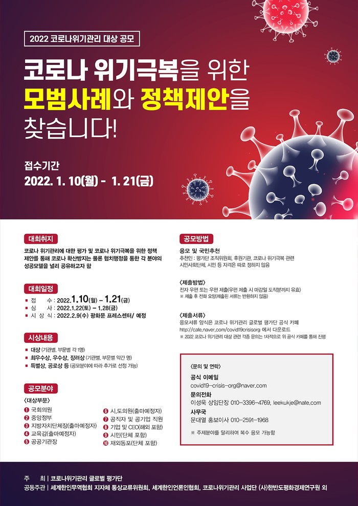 한편, 이번 ‘코로나위기관리 글로벌 평가단’의 <2022 코로나 위기관리 대상 공모대회>는 작년에 시작하여 코로나 위기관리에 초점을 두고 진행된 국내 최초의, 최대 규모의 민간 주최 공모대회다.