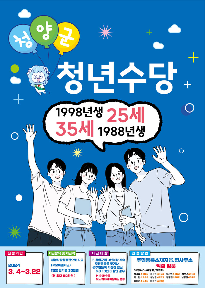 청년수당은 미래세대인 청년의 자립 능력 향상과 경제적 부담을 덜기 위한 제도로 신청 시작일을 기준으로 ▲청양군에 3년 이상 계속해서 주민등록을 두고 있거나 ▲청양군에 계속 거주하지 않더라도 주민등록 기간이 합산해 10년 이상인 경우 받을 수 있다.