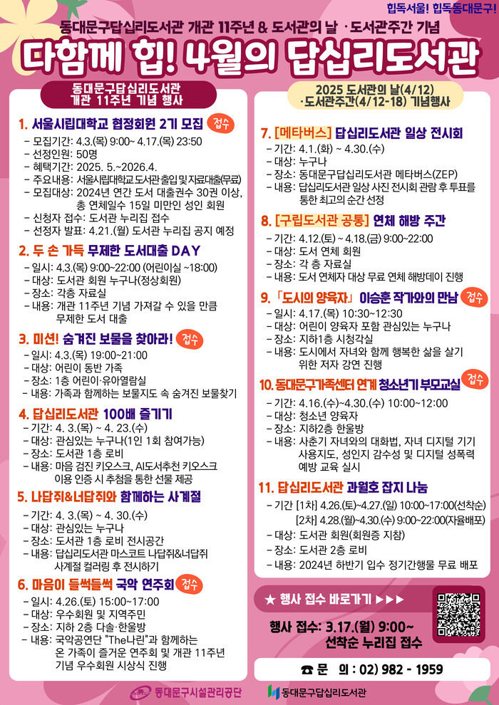 도서관 관계자는“지역주민분들께서 사랑을 주신 덕분에 동대문구답십리도서관이 개관 11주년을 맞이하게 되었다”며“꽃 피는 봄에 우리 도서관에 오셔서 풍성한 독서문화 행사로 모두가 행복하셨으면 좋겠다”고 밝혔다.