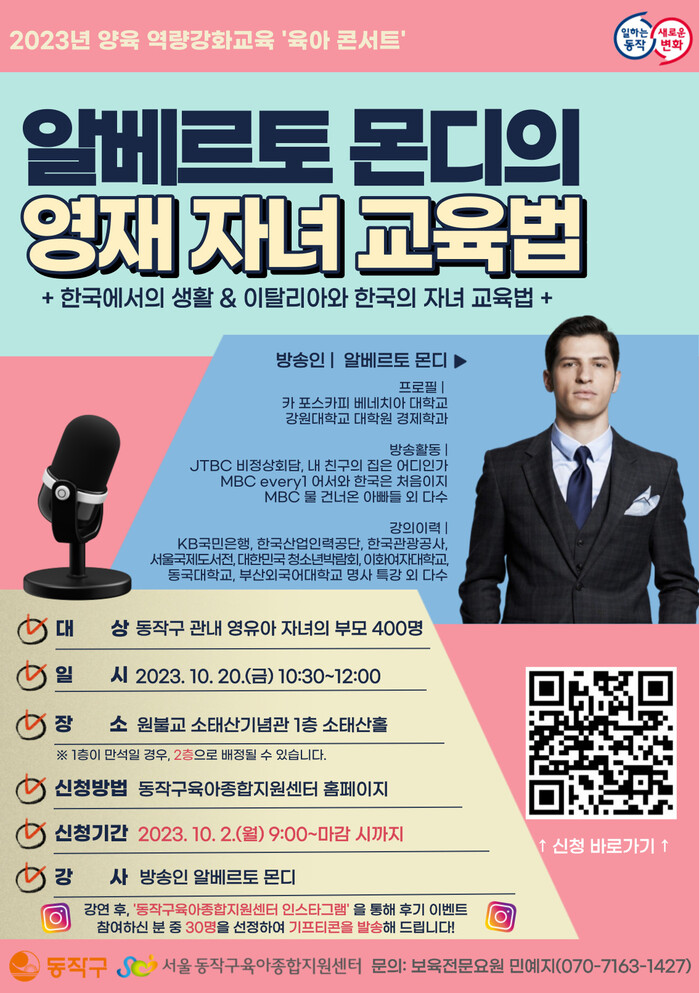 [시민일보 = 여영준 기자] 서울 동작구(구청장 박일하)가 오는 20일 원불교 소태산기념관(현충로 75)에서 ‘알베르토 몬디의 영재 자녀 교육법’ 주제로 육아콘서트를 개최한다.