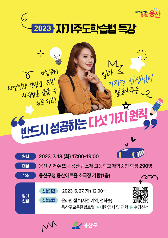 [시민일보 = 홍덕표 기자] 서울 용산구(구청장 박희영)가 오는 7월18일 용산아트홀 소극장에서 스타강사로 유명한 이지영 강사를 초청해 자기주도학습법 특강을 개최한다.