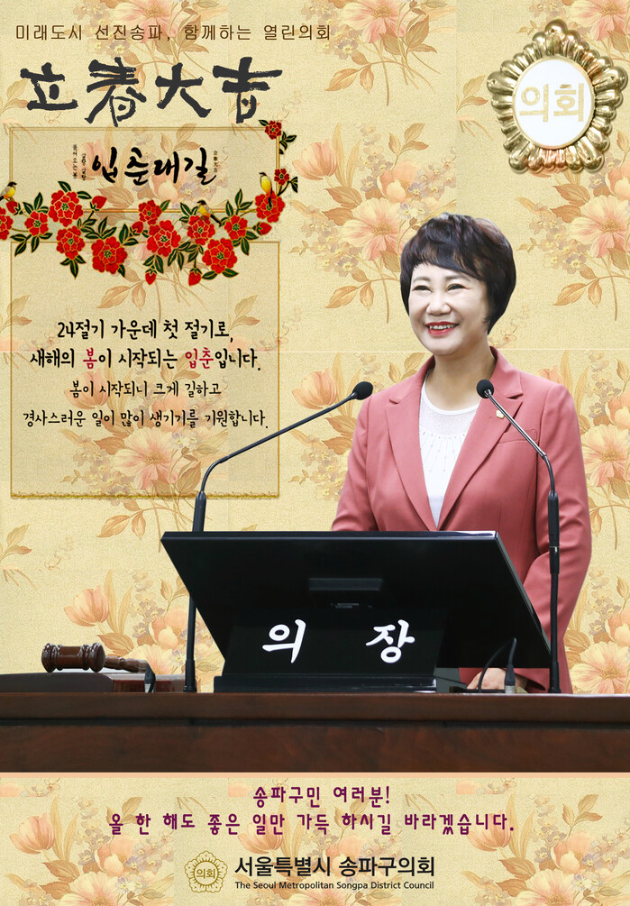 서울특별시 송파구의회(의장 이혜숙)가 2월3일 입춘(立春)을 맞아 ‘한 해를 열고 봄을 알리는 첫 번째 절기인 입춘이 다가왔다. 올 한 해 송파구민 모두 크게 길하고 좋은 일들만 가득하시기를 바란다(立春大吉 建陽多慶)’라며 송파구민들에게 인사를 전했다.