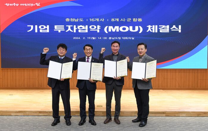 [홍성=최복규 기자] 이용록 충남 홍성군수가 지난 19일 충남도청 대회의실에서 열린 합동 투자협약(MOU) 체결식에서 김태흠 도지사와 3개 기업 대표와 함께 357억원 규모의 투자협약을 체결하며 지역내 고용시장 활성화의 신호탄을 쏘아 올렸다.