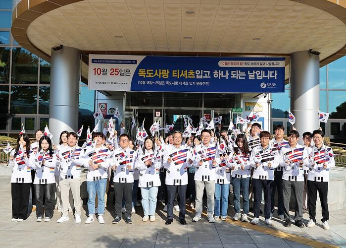 [영양=박병상 기자] 영양군(군수 오도창)은 지난 25일(금) 오전 독도의 날을 기념해 군청사 입구에서 오도창 영양군수를 포함한 공직자 50여 명이 참석한 가운데 ‘독도 사랑 티셔츠 입기 운동’행사를 진행했다.