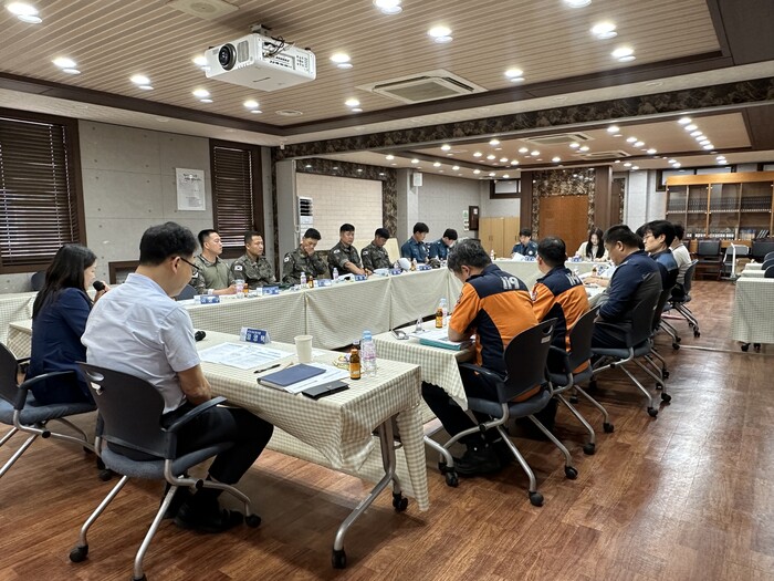 경기 수원시 영통구가 최근 2024년 을지연습 기간 중 실시되는 ‘미상 풍선 살포에 따른 화생방 테러 및 화재 상황 대비 통합대응훈련’을 위한 관계기관 1차 사전 회의를 실시했다. 사진은 이날 참석자들이 회의를 진행하고 있는 모습. (사진=영통구청 제공)