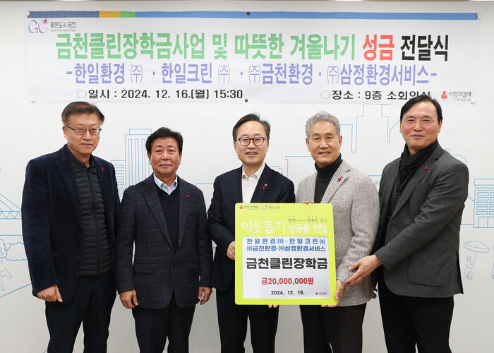 [시민일보 = 여영준 기자] 서울 금천구(구청장 유성훈)는 최근 구청 9층 소회의실에서 청소대행업체 4곳이 장학금과 따뜻한 겨울나기 성금을 기탁했다고 밝혔다.