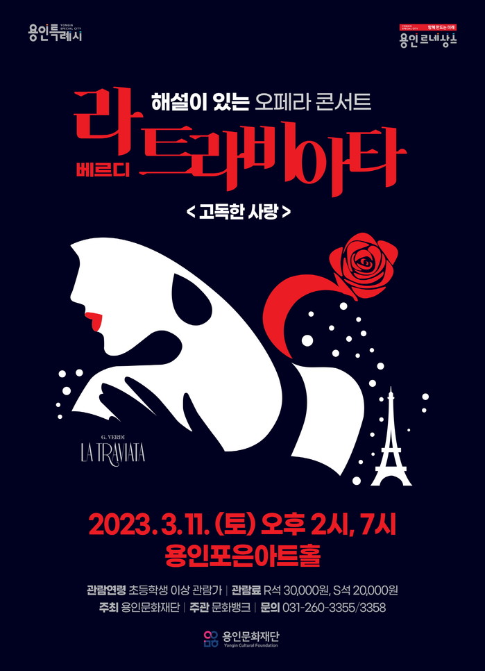 [용인=오왕석 기자] (재)용인문화재단(이사장 이상일)은 오는 3월 11일 용인포은아트홀에서 해설이 있는 오페라 콘서트 ‘베르디 라 트라비아타 <고독한 사랑>’을 선보인다.