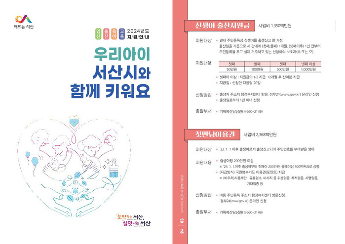 [서산=최복규 기자] 충남 서산시가 2일 올해 임신·출산·육아·교육 지원 사항을 한 권으로 정리한 ‘우리 아이 서산시와 함께 키워요’를 발간해 누리집에 게시했다.