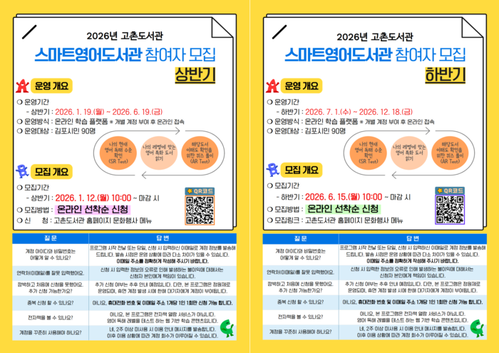 [김포=문찬식 기자] 경기 김포시 고촌도서관이 오는 19일부터 12월18일까지 ‘2026년 스마트영어도서관’을 운영한다.