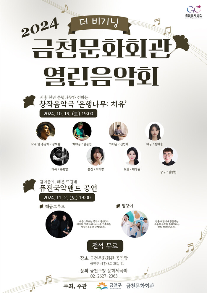 음악회에서는 구의 지역자원이자 보호수인 ‘은행나무’를 소재로 한 창작 음악극 ‘은행나무 : 치유’와, 금천구를 주 무대로 활동하며 주목받고 있는 ‘해금그루브’, ‘정강이’의 퓨전 국악 공연을 즐길 수 있다.