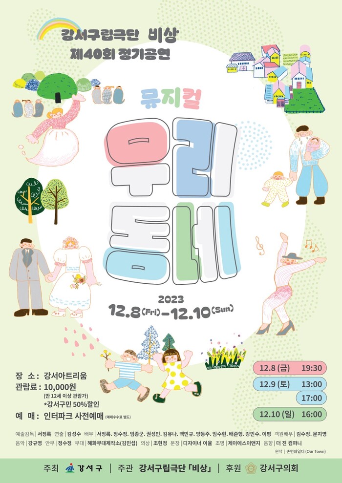 [시민일보 = 홍덕표 기자] 서울 강서구(구청장 진교훈)가 오는 8~10일 강서아트리움에서 강서구립극단 '비상'의 제40회 정기공연인 뮤지컬 ‘우리동네’를 개최한다.