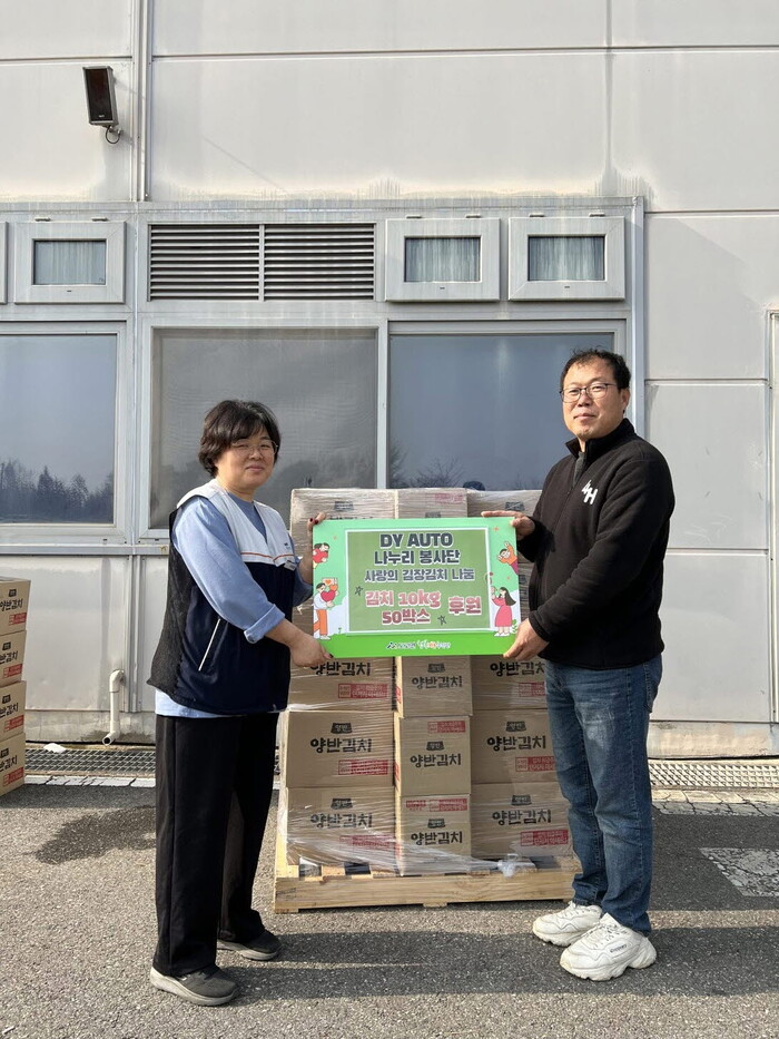 [아산=박명수 기자] 도고농공단지에 있는 DY AUTO 나누리 봉사단이 최근 충남 아산시 도고면 행복키움추진단에 지역내 소외계층들을 위한 김장 김치 500kg을 기부했다.