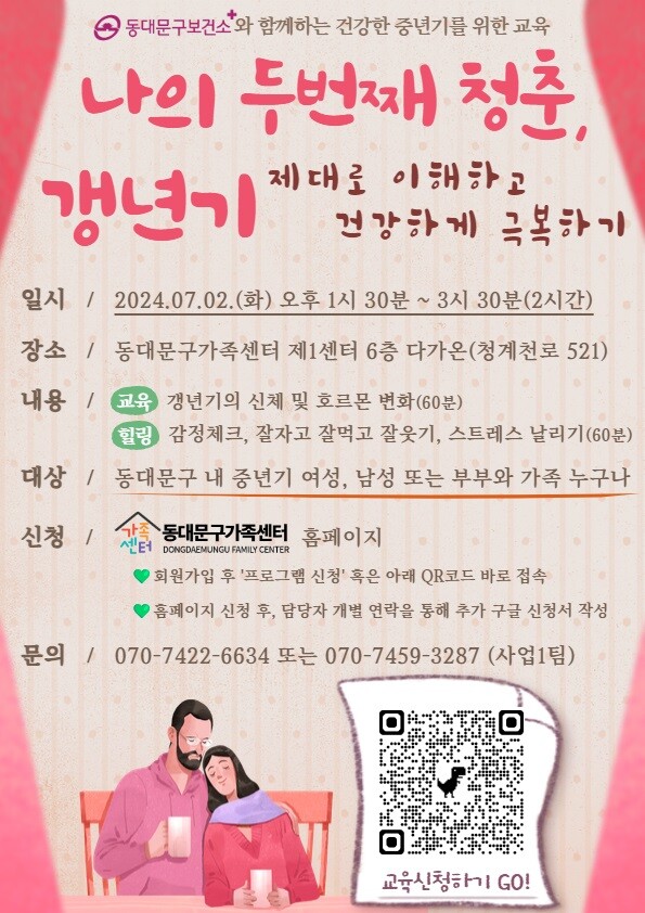 [시민일보 = 이대우 기자] 서울 동대문구(구청장 이필형)가 오는 7월2일 갱년기 여성 건강관리를 주제로 ‘갱년기, 나의 두 번째 청춘’ 특강을 개최한다.