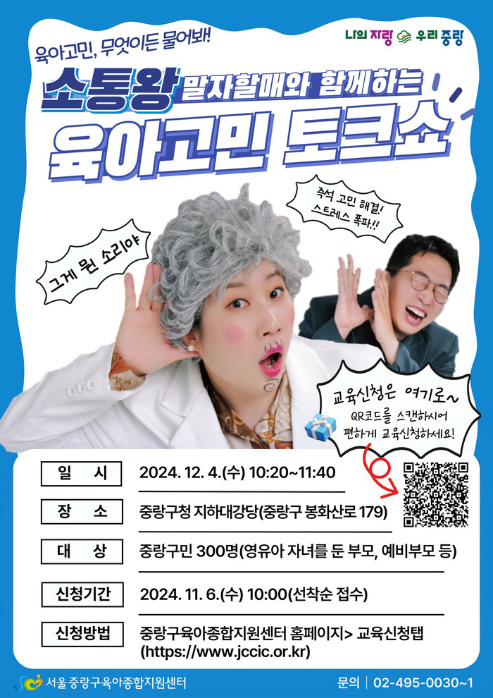 육아 토크쇼 참여 신청은 중랑구 육아종합지원센터 누리집에서 가능하다. 행사 포스터에 포함된 큐알(QR)코드를 촬영하면 신청 화면으로 바로 연결된다.