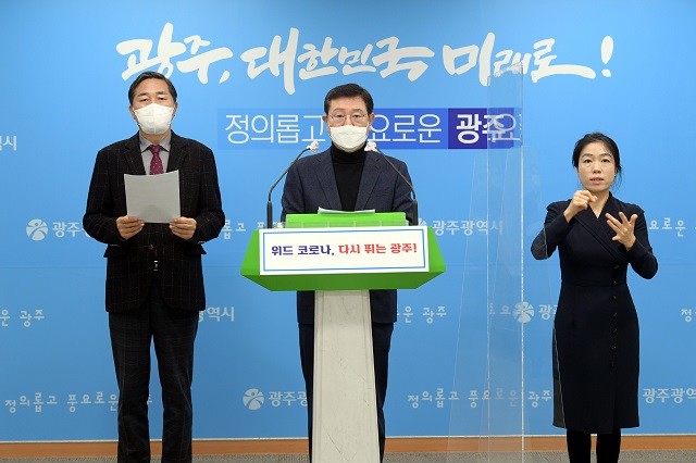 | ▲ 이용섭 광주광역시장이 1일 오후 시청 브리핑실에서 김용집 광주광역시의회 의장과 함께 '국립심뇌혈관센터 조속 설립 촉구' 공동성명을 발표하고 있다./광주광역시 제공 |