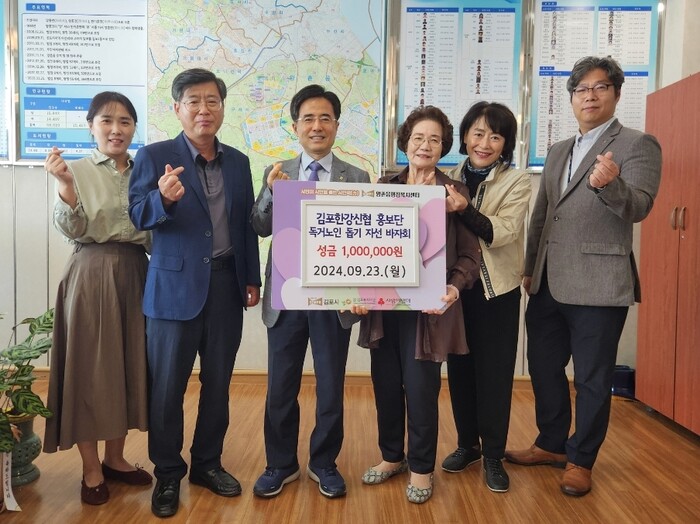 김포한강신협 홍보단이 23일 홀몸노인을 돕기 위해 바자회 수익금 100만원을 김포시 양촌읍행정복지센터에 기탁했다. 사진은 기탁식에 참석한 관계자들이 기념촬영을 하고 있는 모습. (사진=양촌읍행정복지센터 제공)