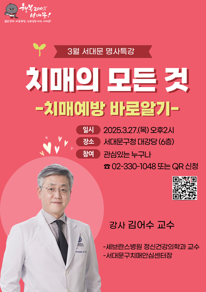 이성헌 서대문구청장은 “초고령사회 속에서 치매 예방과 관리를 위해 유익한 정보를 얻는 시간이 될 것으로 기대하며 앞으로도 다양한 분야의 명사들로부터 통찰과 지혜를 배울 수 있는 강연을 꾸준히 마련하겠다”고 말했다.