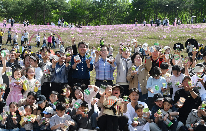 서울 노원구가 최근 불암산 힐링타운에서 ‘2025 불암산 철쭉제’ 개막 행사를 진행했다. 사진은 개막식에서 오승록 구청장이 1500마리 나비날리기 퍼포먼스에 참여한 모습. (사진=노원구청 제공)