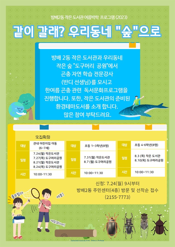 서충민 방배2동장은 “여름방학을 맞아 독서와 체험활동을 함께한 독서문화프로그램을 통해 어린이들이 책과 한층 더 가까워지는 기회가 되길 바란다”며, “앞으로도 방배2동 작은도서관 활성화로 작은도서관이 동네문화 거점지 역할을 하도록 노력하겠다”라고 말했다.