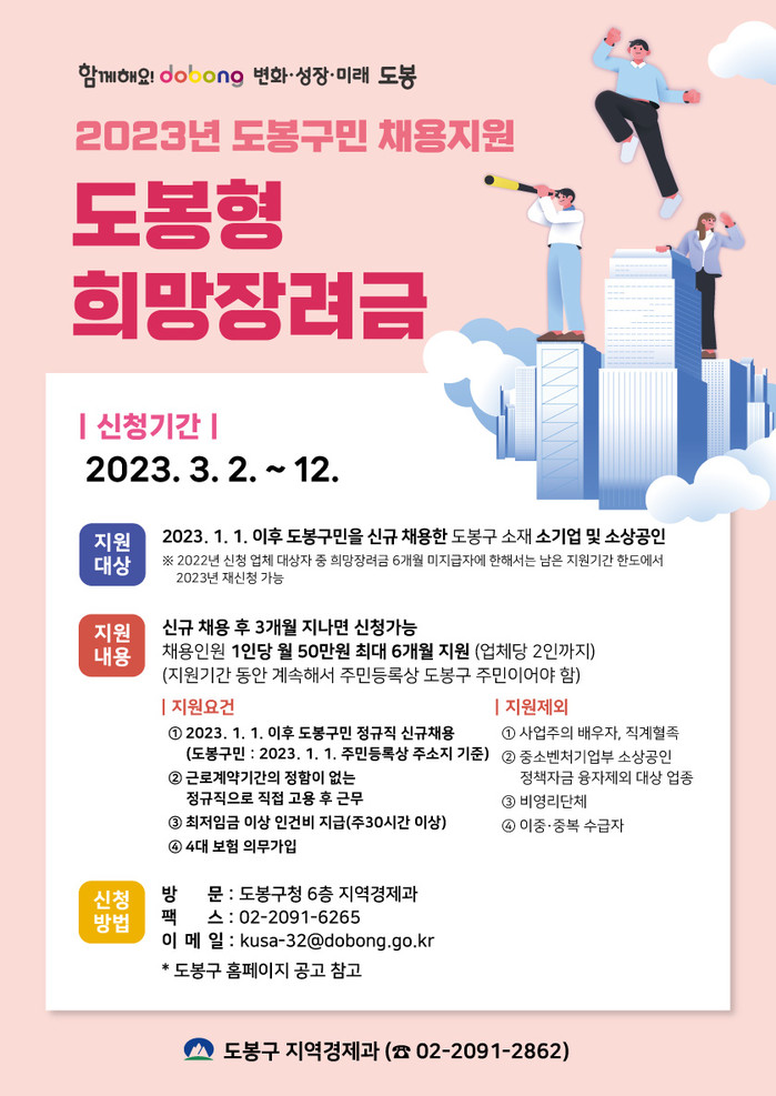 [시민일보 = 박준우 기자] 서울 도봉구(구청장 오언석)가 어려움을 겪고 있는 소기업과 소상공인들 위해 '도봉형 채용 희망장려금 지원사업'을 시행한다고 10일 밝혔다.