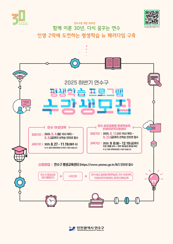 [인천=문찬식 기자] 인천 연수구(구청장 이재호)는 구민의 배움과 성장을 지원하기 위해 연수·송도 글로벌 평생학습관 ‘2025년 하반기 평생학습 프로그램’ 수강생을 오는 13일부터 모집한다.