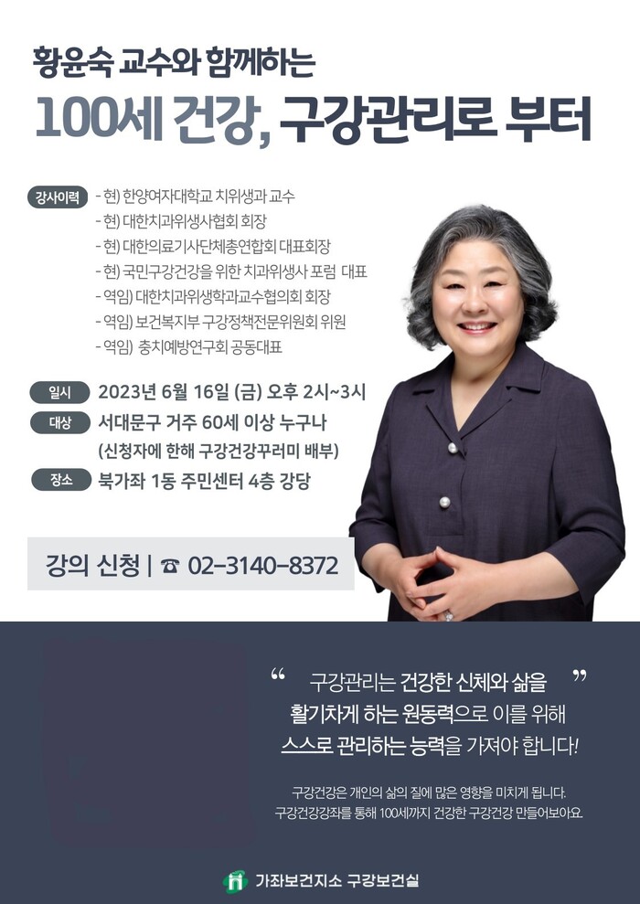 | ▲ 구강보건의 날 기념 황윤숙 교수와 함께하는 '100세 건강, 구강 관리로부터' 특강 포스터. (사진=서대문구청 제공) |