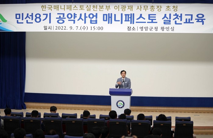 매니페스토 특강은 민선8기 공약을 성공적으로 추진하기 위해 공약의 필요성, 공약 실천계획서 작성요령 및 평가방법, 공약 재원조달 방안, 영암군을 위한 정책 제언 등의 내용으로 진행됐다.