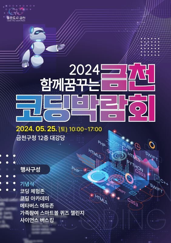 [시민일보 = 여영준 기자] 서울 금천구(구청장 유성훈)는 25일 구청 대강당에서 오전 10시부터 오후 5시까지 ‘함께 꿈꾸는 금천 코딩박람회’를 개최한다고 밝혔다.