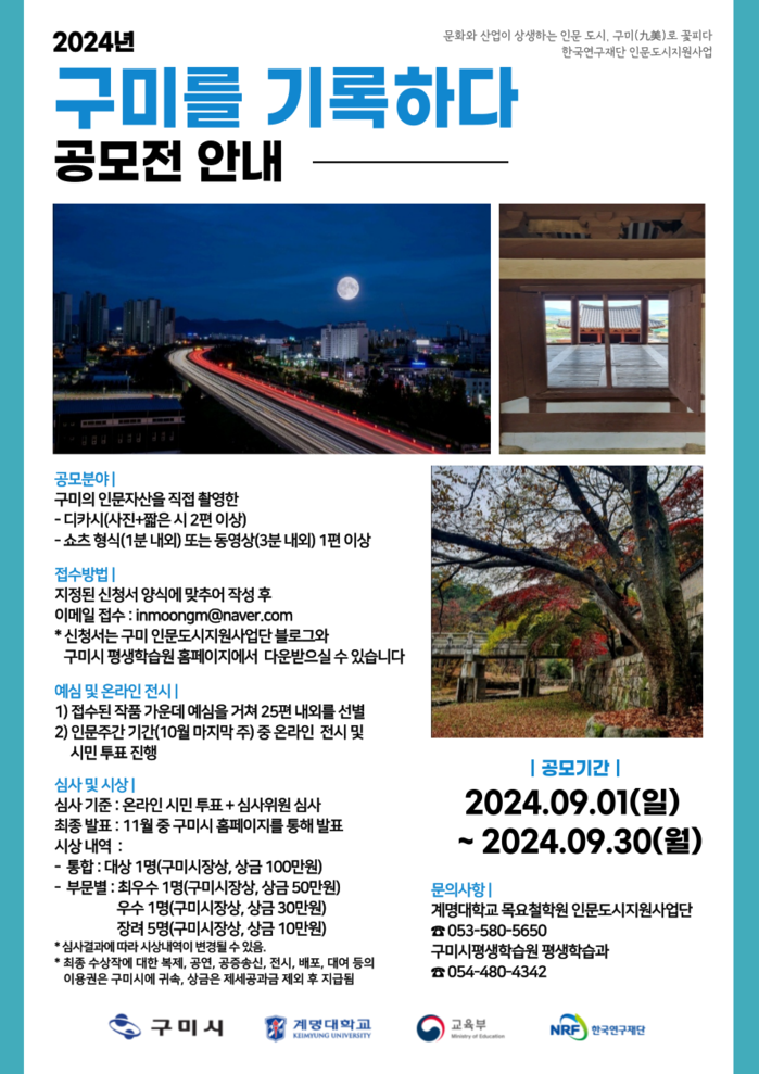 내용은 구미의 문화유산, 명승지, 풍경, 예술 등 구미의 자랑거리이자 인문 자산을 대상으로 하는 작품이면 시민 누구나 출품할 수 있다.