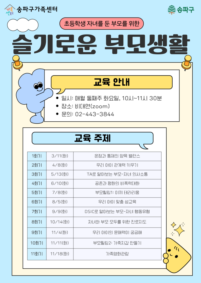 [시민일보 = 이대우 기자] 송파구(구청장 서강석)가 오는 11월까지 초등학생 자녀를 둔 부모를 위한 부모교육 “슬기로운 부모생활”을 운영한다.