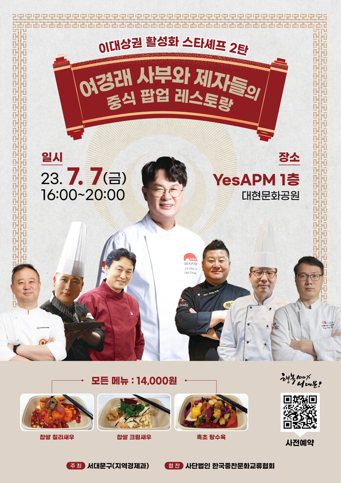 [시민일보 = 홍덕표 기자] 서울 서대문구(구청장 이성헌)가 지난달 홍신애 셰프의 '이탈리안 레스토랑'에 이어 7일 '여경래 사부와 제자들'이라는 콘셉트로 두 번째 '스타셰프 팝업 레스토랑'을 연다.