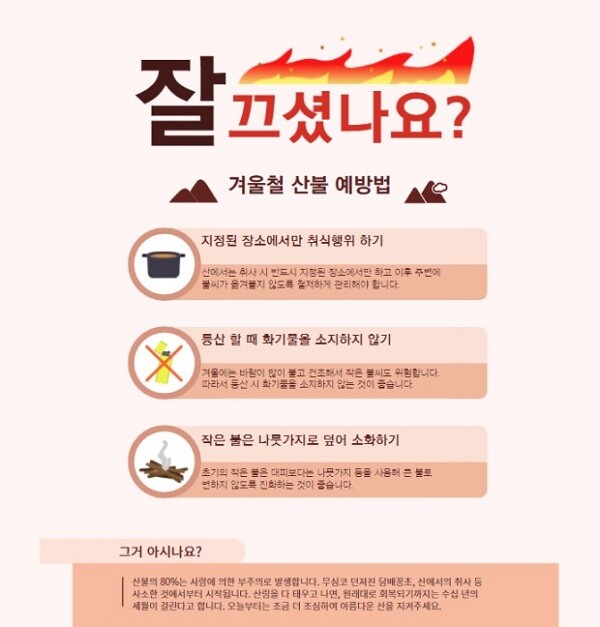 등산객 및 산림인접 주민들이 지켜야 할 주요 안전 수칙은 ▲입산이 통제된 구역은 출입 금지 ▲지정된 장소 외 취사 금지▲등산 시 라이터, 버너 등 화기 소지 금지 ▲산림 내 흡연ㆍ담배꽁초 투기 금지 ▲인접주변 쓰레기 소각 금지 등이다.
