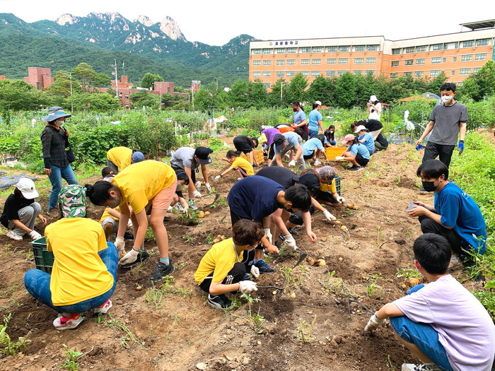 서울 도봉구는 지난 12일 쌍문동 친환경 나눔텃밭에서 지역내 초등학생을 대상으로 감자캐기 체험을 진행했다. 이날 체험에는 서울백운초등학교 5학년 2개반 학생들이 참가했으며 직접 흙을 만지며, 감자를 직접 캐보는 시간을 보냈다. 사진은 지역 초등학생들이 감자캐기 체험을 하고 있는 모습. (사진제공=도봉구청)