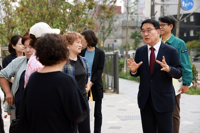 | ▲ 문헌일 구청장이 교통환경 개선 현장 방문에서 주민들과 이야기를 나누고 있다. (사진=구로구청 제공) |