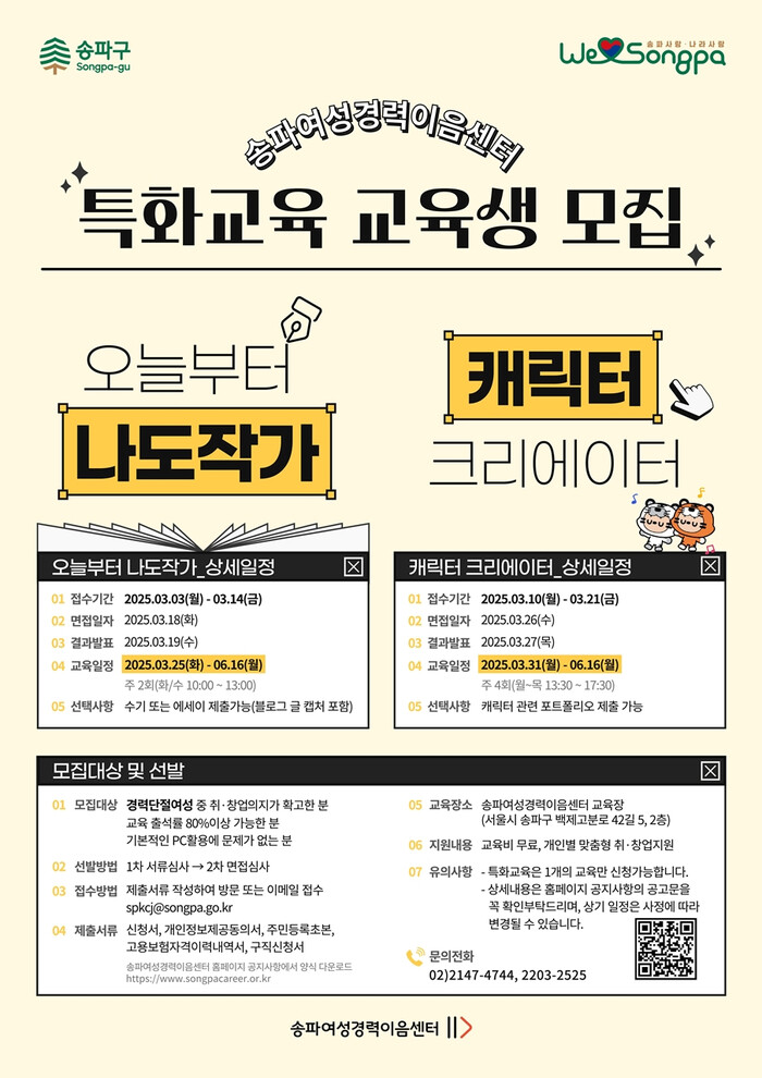 참여 희망자는 센터 홈페이지를 참고하여 ‘오늘부터 나도 작가’ 과정은 오는 14일까지, ‘캐릭터 크리에이터’ 과정은 오는 21일까지 방문 또는 이메일(spkcj@songpa.go.kr)로 신청하면 된다.