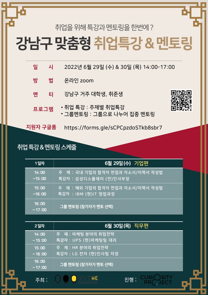자세한 사항은 강남구 일자리정책과 또는 ‘큐리아서티 프로젝트’로 문의하면 된다.
