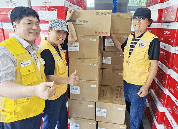 | ▲ 대한적십자사 봉사회 회원들이 린나이 구호 물품에 감사를 표하고 있다 |