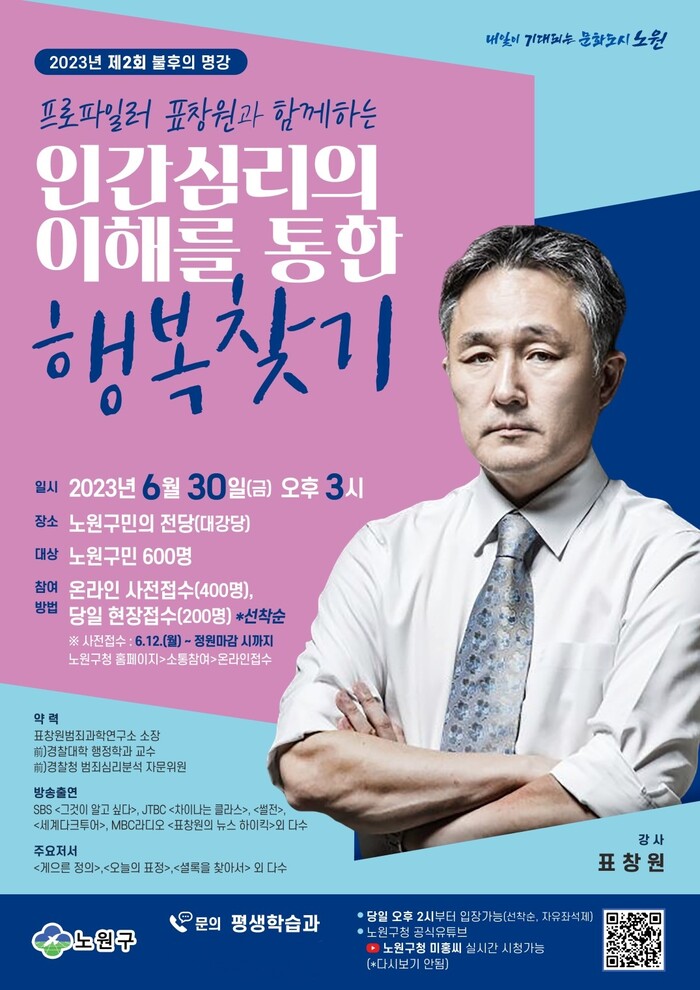 [시민일보 = 홍덕표 기자] 서울 노원구(구청장 오승록)가 오는 30일 오후 3시 노원구민의전당 대강당에서 '2023년 제2회 불후의 명강'을 개최한다.