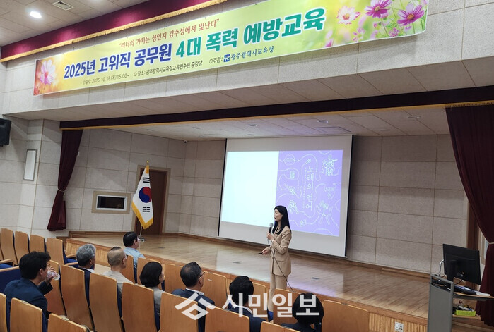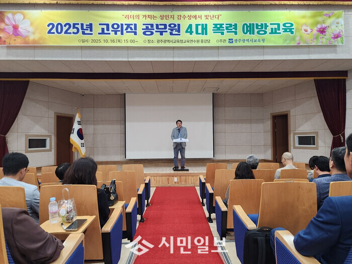 [광주=정찬남 기자] 광주광역시교육청(교육감 이정선)은 16일 교육연수원 중강당에서 5급 이상 공무원을 대상으로 ‘4대 폭력(성희롱·성매매·성폭력·가정폭력) 예방교육’을 실시했다.