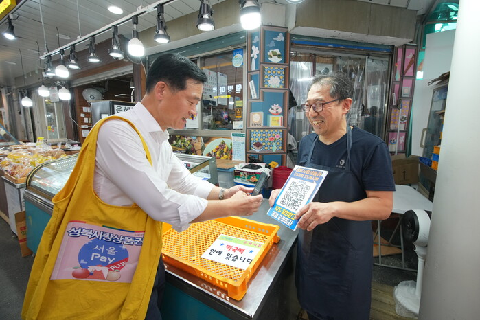 이승로 서울 성북구청장은 지난 10일 추석을 맞아 장위전통시장에 방문해 과일, 떡 등 차례용품을 성북사랑상품권을 이용해 구매했다. 사진은 이 구청장(왼쪽)이 떡집에서 송편 등 떡을 구매하는 모습. (사진=성북구청 제공)