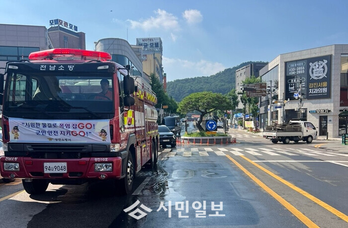 | ▲ 강진소방서, 폭염 저감 위해 강진읍 시가지 살수차 운행 자료사진 / 강진소방서 제공 |