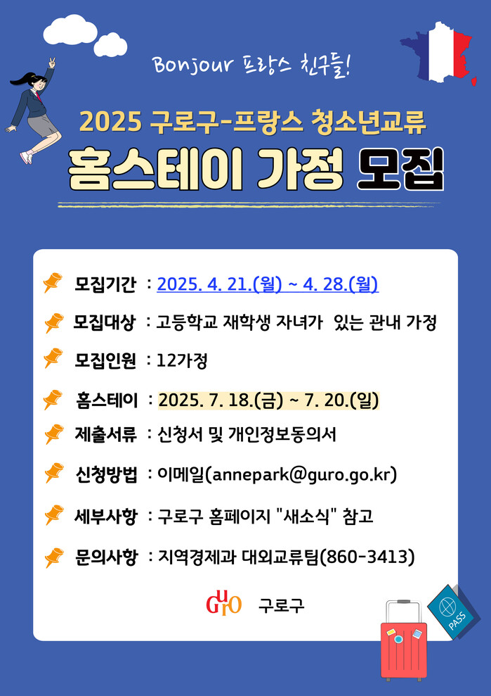 | ▲ 구로구-프랑스 청소년교류 홈스테이 가정 모집 홍보 안내문. (사진=구로구청 제공) |