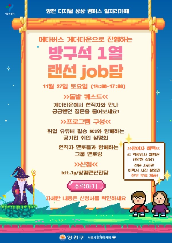 ‘방구석 1열 랜선 job담’에서는 취업 유튜버 ‘필승 NCS’가 알려주는 ‘공기업 취업 설명회’를 비롯하여, 채용시장에서 현직 면접관으로 활동 중인 이남희 대표(나미 콘텐츠)와 양천디지털상상캠퍼스 멘토단이 참여하는 그룹 멘토링 등을 통해 청년 구직자들의 취업 관련 궁금증을 해소할 예정이다.