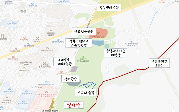 일자산은 허브천문공원, 종달새유아숲, 강동그린웨이 캠핑장, 치유의 숲길, 잔디광장 등이 조성돼 있어 남녀노소 모두 즐거운 시간을 보낼 수 있는 강동구의 대표적인 근린공원이다.