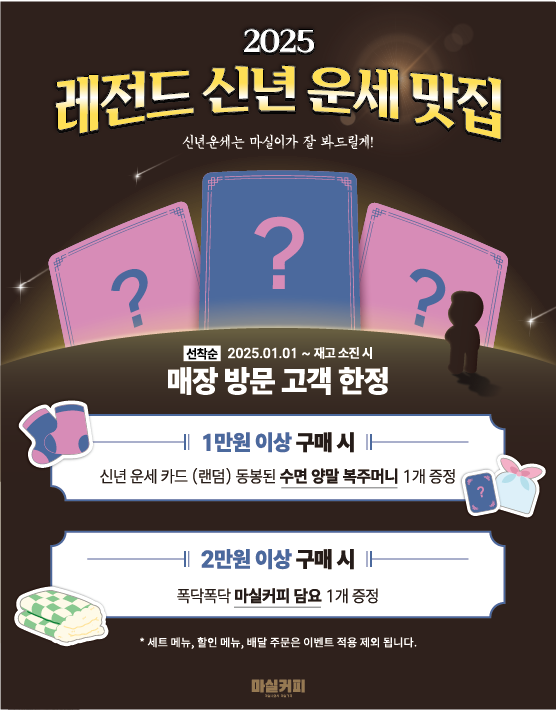 이번 새해 이벤트는 마실커피를 사랑해 주신 고객들에게 감사의 마음을 전하는 동시에, 브랜드만의 따뜻한 가치를 더욱 많은 이들에게 알리고자 기획됐다. 이벤트는 고객의 구매 금액에 따라 한정판 굿즈를 증정하는 방식으로 진행되며, 1만 원 이상 구매 고객에게는 수면양말(색상 2종 랜덤)과 운세카드(랜덤 5종 중 1장 동봉)가, 2만 원 이상 구매 고객에게는 담요가 제공된다. 각 매장에서 준비된 굿즈는 한정 수량으로, 재고 소진 시 행사가 종료된다.