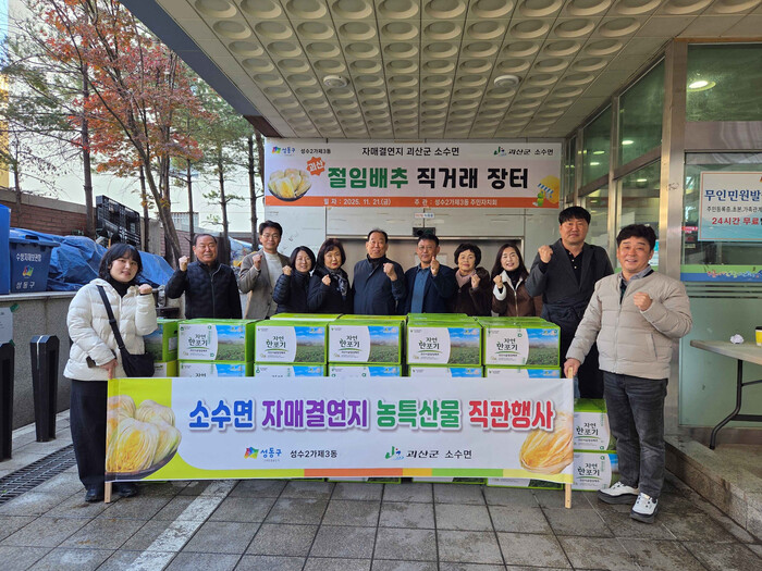 [시민일보 = 박소진 기자] 성동구(구청장 정원오) 성수2가제3동(동장 신경숙)은 지난 11월 21일 충북 괴산군 소수면(면장 안창균)과 함께 성수2가제3동 주민센터 앞에서 충북 괴산군 소수면의 특산품 '절임배추' 직거래 장터를 개최했다.