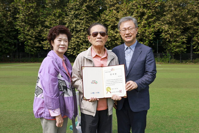 [시민일보 = 박소진 기자] 서울 구로구(구청장 장인홍)가 9월30일 고척동 계남근린공원 인조잔디축구장에서 14년간 자원봉사자로 활동한 이수영 노인에게 감사장을 전달했다.