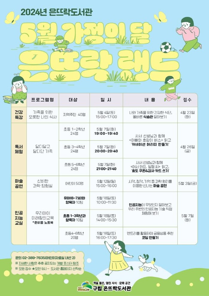 [시민일보 = 이대우 기자] 서울 은평구(구청장 김미경)는 구립은뜨락도서관이 5월 가정의 달을 맞아 어린이들과 가족들을 위한 다채로운 행사 ‘은뜨락 랜드’를 운영한다고 밝혔다.