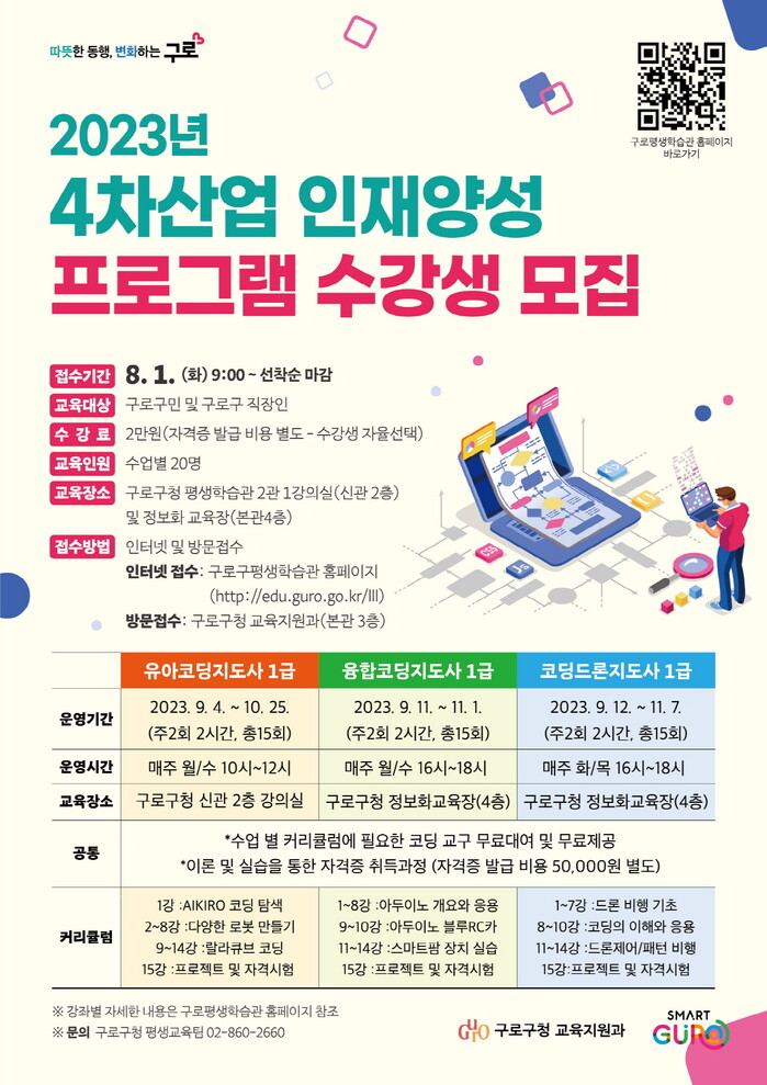 구 관계자는 “이번 교육이 4차산업 기술의 역량 강화와 미래지향적인 새로운 직업 선택의 기회가 될 것”이라며 “주민 여러분의 많은 관심을 바란다”고 전했다.