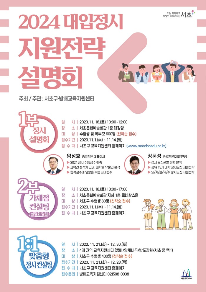 설명회와 1:1 가채점 컨설팅은 선착순으로 모집하며, 14일까지 서초구 교육지원센터 홈페이지에서 하면 된다.